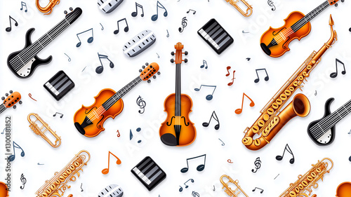 Musical instruments seamless pattern featuring guitars, violins, saxophones, and pianos with notes. Perfect for music themed designs and backgrounds