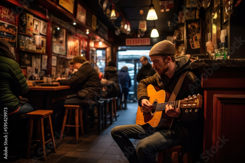 Musician playing guitar in Irish pub, trad music session. Generative AI