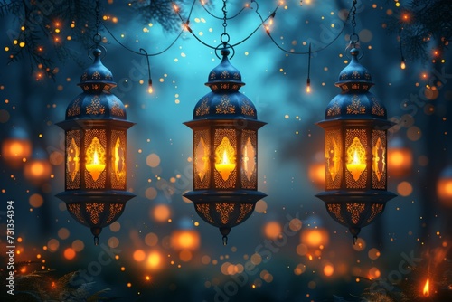 Muslim Holy Month Ramadan Kareem - Ornamental Arabic Lantern With Burning Candle Glowing At Evening