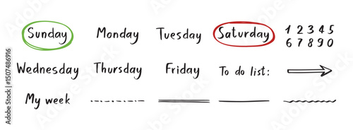 My week handwritten names days and numbers, underlines. Doodle hand drawn set