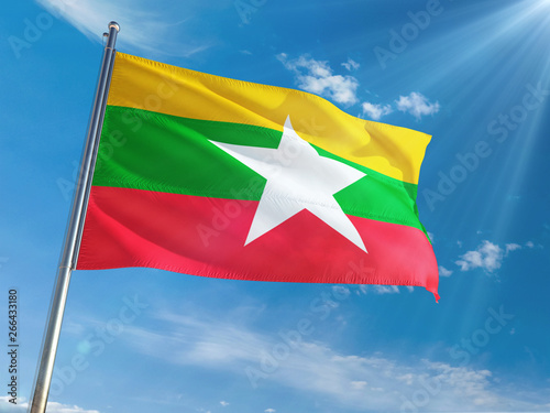 Myanmar - Burma National Flag Waving on pole against sunny blue sky background. High Definition