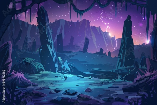 Mysterious Alien Landscape with Bioluminescent Plants and Lightning Storm