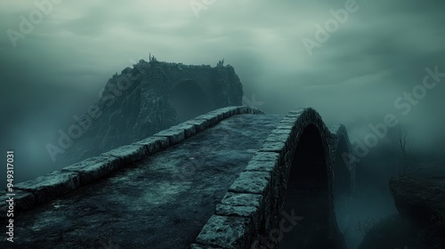 Mysterious Ancient Stone Bridge in Foggy Landscape with Dark Atmosphere and Eerie Ambiance