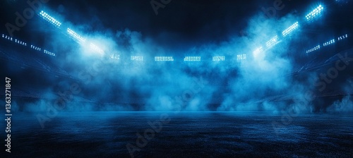 Mysterious blue-lit stadium, shrouded in fog. An evocative scene of anticipation and potential.