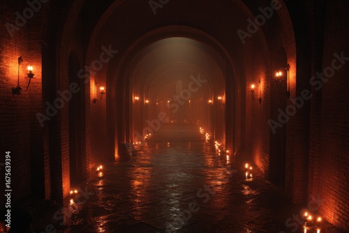 Mysterious candlelit corridor illuminated by flickering lights creating an eerie ambiance in a dark subterranean space with wet stone floor
