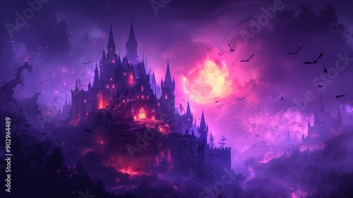 Mysterious Castle Surrounded by Dark Forest and Glowing Moonlight During a Spooky Night