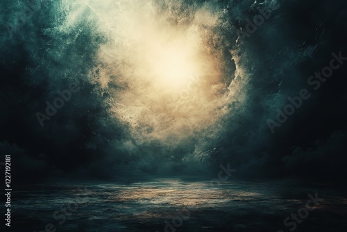 Mysterious cloudy landscape illuminated by enigmatic light during twilight hours
