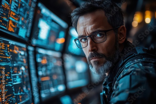 mysterious cybersecurity hacker working in dark digital environment with multiple screens displaying complex code and network intrusion attempts