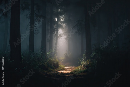 Mysterious Dark Forest Path at Night with Glowing Lights