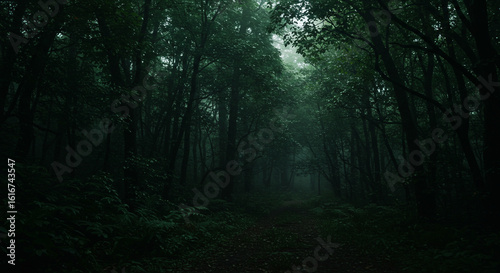 Mysterious dark forest path shrouded in mist, inviting exploration