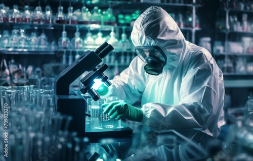 Mysterious doctor in a suit examines hazardous materials using a microscope in a professional office setting.