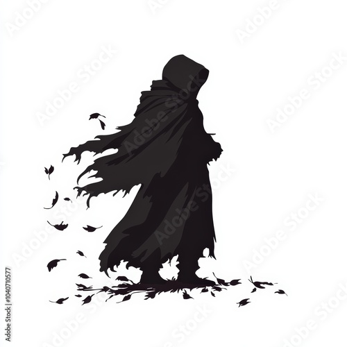 Mysterious figure in a cloak, surrounded by swirling leaves, white isolated background.
