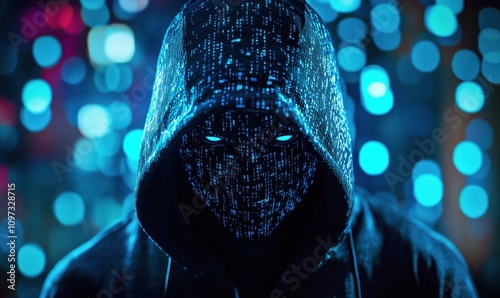 Mysterious figure in digital mask, glowing blue binary code, dark hoodie, cyberpunk aesthetic, blurred colorful background