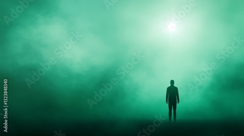 Mysterious figure in foggy field serene and atmospheric landscape solitary