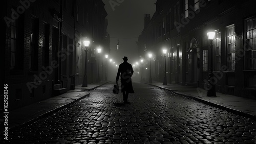 Mysterious Figure in the Mist: Ominous Shadow on Desolate Cobblestone Street