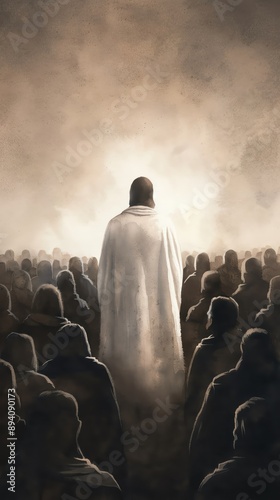 Mysterious figure in white robe surrounded by ominous crowd, conveying themes of solitude, mystery, and spirituality.