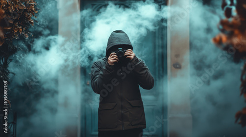 mysterious figure stands in dark, misty environment, capturing haunting atmosphere with camera. fog envelops scene, enhancing eerie vibe