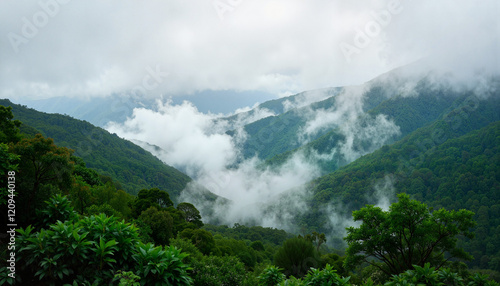 Mysterious fog enveloping lush rainforest, serene atmosphere