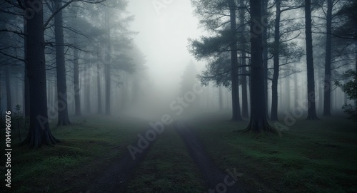 Mysterious fog rolling through an abandoned forest background thick fog creeping along the forest floor obscuring the path ahead