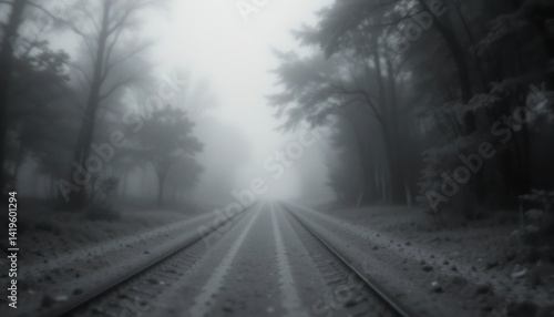 Mysterious foggy scene on abandoned railroad tracks enigmatic atmosphere black and white photography serene wilderness perspective of isolation