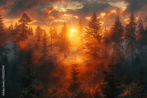 Mysterious foggy sunrise in the pine forest. Beautiful nature scene..,.