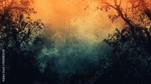 Mysterious forest background with warm hues and dark silhouettes