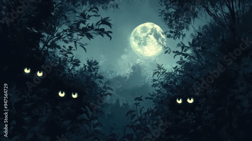 Mysterious Forest Night with Glowing Eyes and Full Moon.
