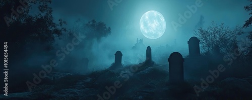Mysterious graveyard scene illuminated by a full moon, surrounded by fog and eerie silhouettes of gravestones.