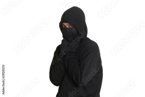 Mysterious man wearing black hoodie standing and looking at camera. Isolated image on gray background