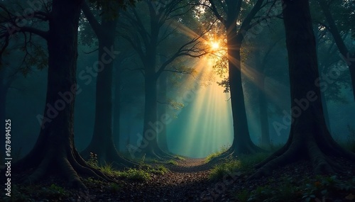 Mysterious, shadowy depths of a dark forest at twilight Ancient trees loom, sunlight barely piercing the dense canopy A sense of mystery and the unknown pervades the scene , calm, brown