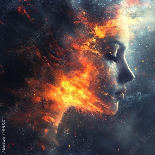 Mysterious Woman With Fiery Elements Blending Into Her Silhouette Surrounded by Cosmic Dust at Twilight