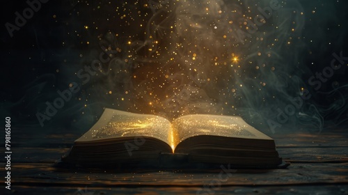 Mystery open book with shining light. Fantasy book with magic light and stars on a table with black background and copy space