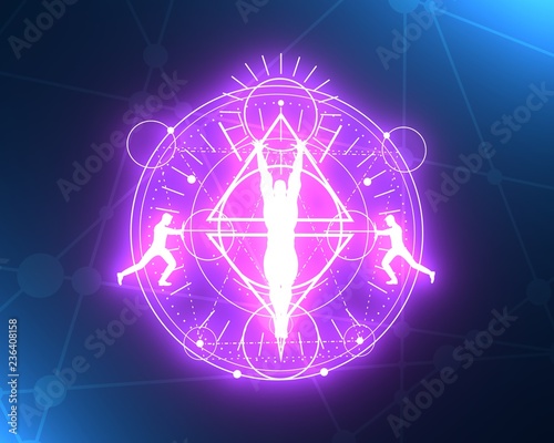 Mystery, witchcraft, occult and alchemy tattoo sign. Mystical vintage gothic geometry thin lines symbol with silhouettes of a men. 3D rendering