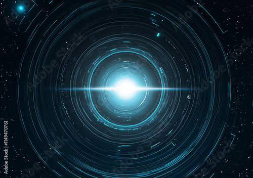 mystical abstract blue design with circular gradient and glowing center, resembling futuristic portal or wormhole in space, surrounded by digital patterns and stars