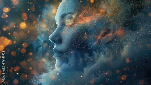 Mystical AI-generated human face materializing from a cloud of data particles, creating an ethereal ambiance. AI human face