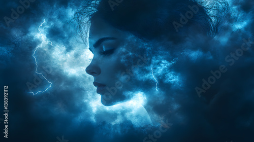 Mystical Aura: A woman's serene profile emerges from a swirling storm of electric blue energy, illuminated by flashes of lightning. Evoking both calm and chaos, with a touch of fantasy and mystique.
