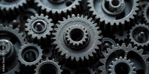 Mystical black metal gears form a mesmerizing spiral; the central giant commands attention flanked by delicate counterparts, crafting an intricate mechanical ballet