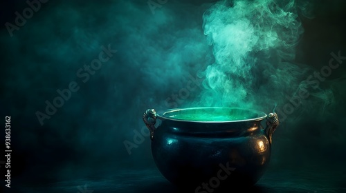 Mystical bubbling cauldron with swirling green smoke rising isolated against a dark moody background with space above for text overlay or copy Conceptual image evoking fantasy magic
