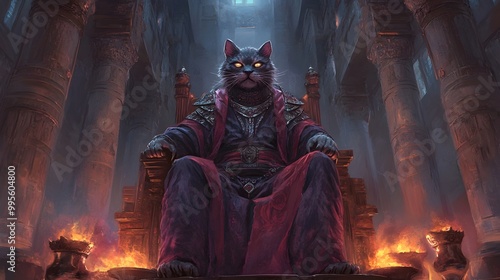 Mystical Cat-Headed Ruler Enthroned in Ornate Ceremonial Chamber