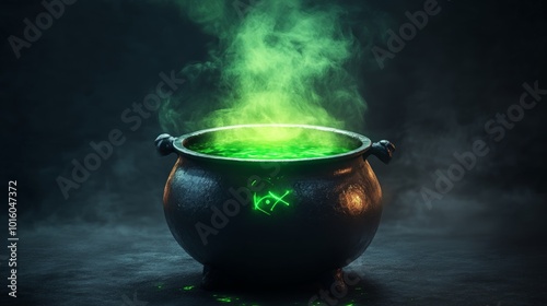 Mystical Cauldron of Enchantment, a dark and foggy scene featuring a cauldron bubbling with a vibrant green potion, evoking a sense of magic and intrigue in the air.
