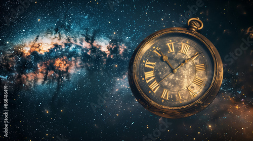 Mystical Clock Face on Night Sky with Stars: Philosophical Exploration of Space, Time, and Transience, Old Watch Clock on Celestial Background, Symbolizing the Philosophy of Time and Transient