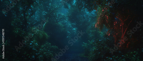 Mystical enchanted forest with magical atmosphere in darkness and subtle light