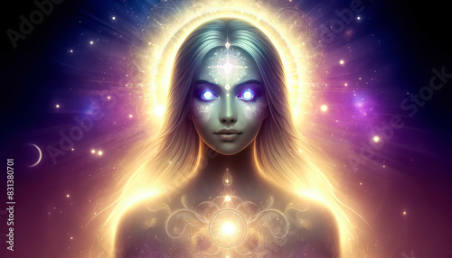 Mystical Ethereal Being With Glowing Eyes And Third Eye Concept Surrounded By Cosmic Light Halo - AI Generated