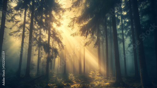 Mystical forest background with dense fog and sun rays peeking through tall ancient trees