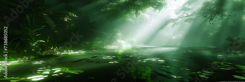 Mystical Forest Light: Sunbeams Piercing Through Trees in a Foggy Woodland, Creating a Serene and Enchanting Scene