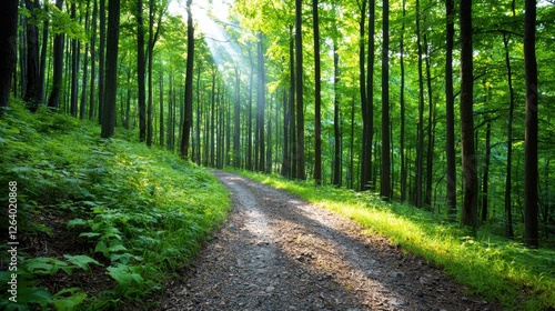 Mystical forest path winding through a serene and tranquil landscape surrounded by towering ancient trees with lush green foliage The sunlight filters through the canopy