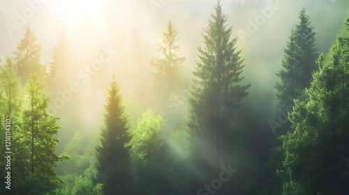 Mystical forest with dense evergreen trees shrouded in morning mist, creating a serene and tranquil natural landscape perfect for nature photography and exploration themes