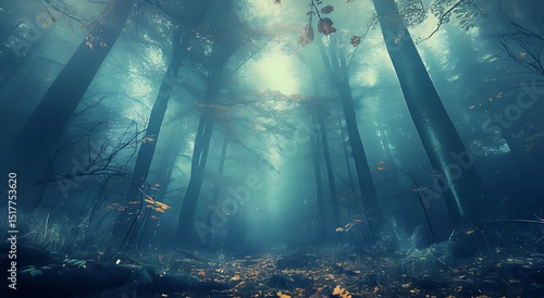 Mystical forest with fog and autumn leaves, forest background