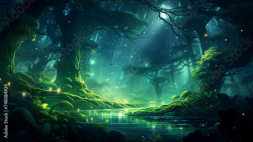 Mystical forest with glowing plants, illuminated by moonlight, reflecting in a tranquil pond
