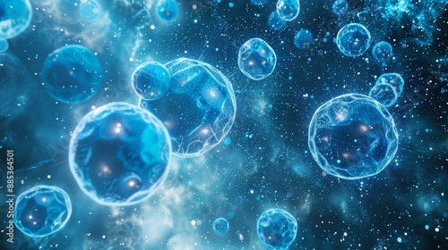 Mystical glowing blue spheres floating in space.